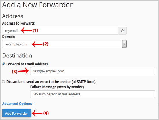 Step 3: On the "Add a New Forwarder" page you will see the "Address to forward:" field. If you want to forward your myemail@example.com to your custom e-mail address, enter "myemail" (without the quotes) in the "Address to forward" field, and should you have multiple domains, select the appropriate one from the domain drop-down list.