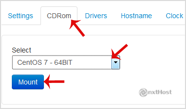 4. Now click on the "CDRom" tab and if the CD-ROM is already mounted, click on unmount and then select your operating system from list. Then click on "Mount".